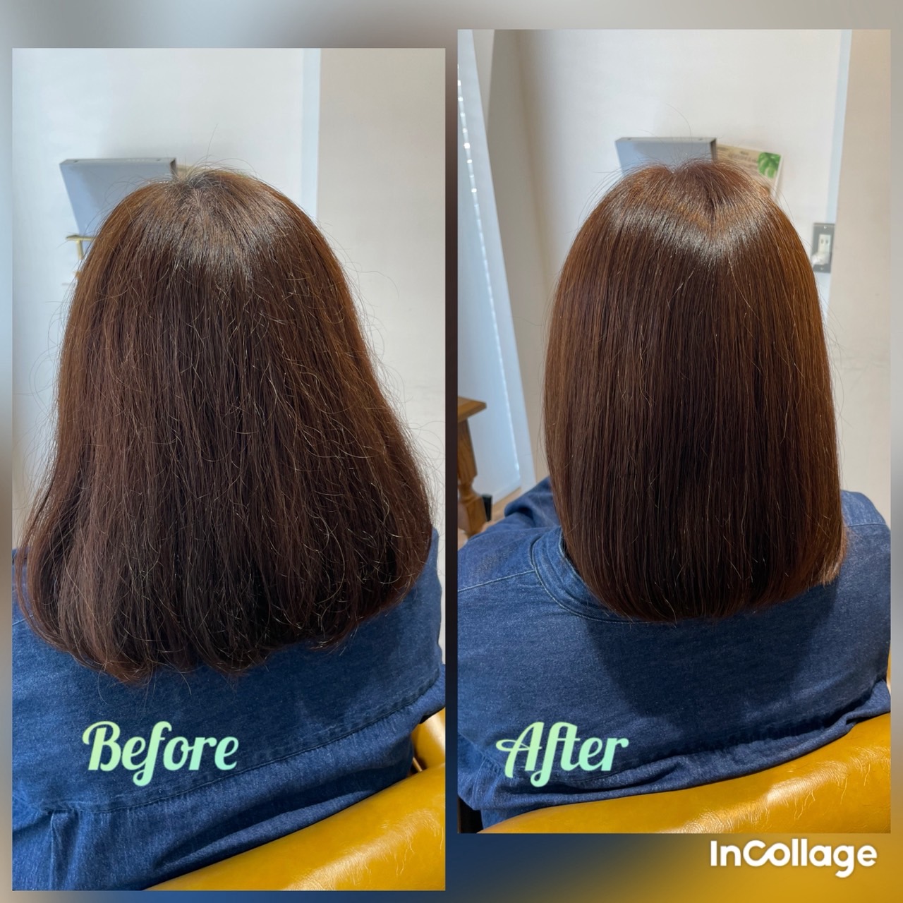 こちらのお写真のお客様は、ビフォーのお写真のように、根元から髪が膨らみやすいクセがもともとあり、毛先までまとまらないのがお悩みでした。